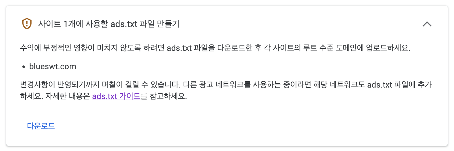 - 구글의 애드센스 페이지에서 ads문제 해결하기를 통해 ads.txt 파일을 다운받는다.