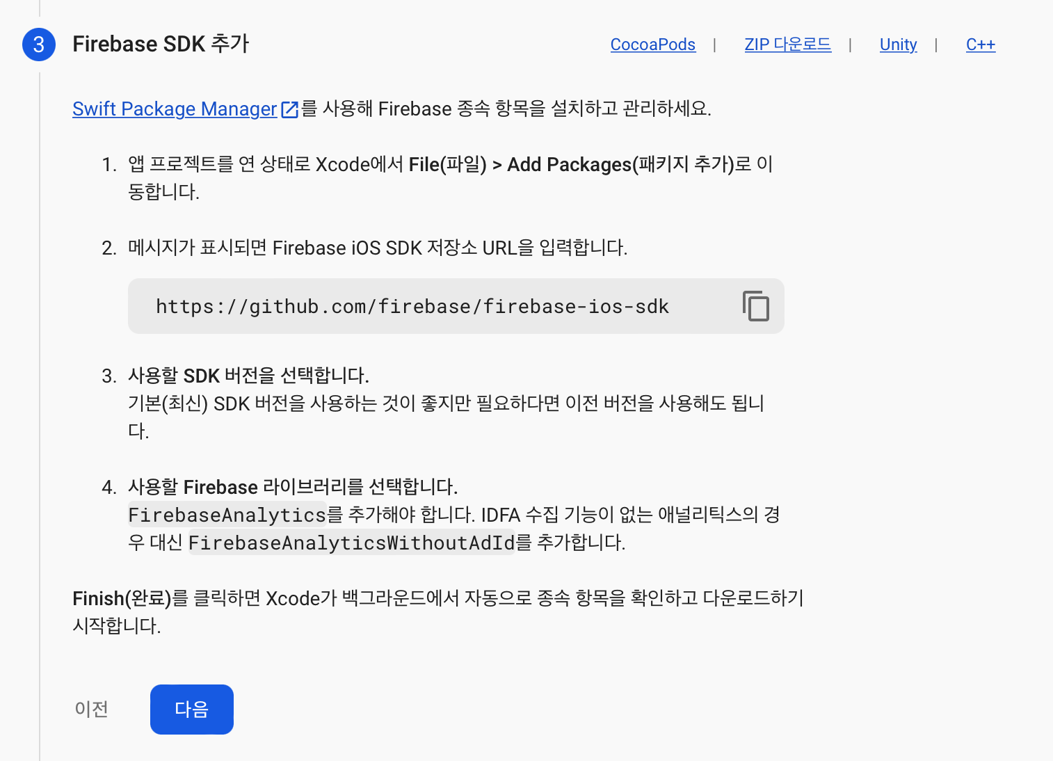 그리고 시키는대로 firebase sdk 를 Swift Package Manager를 통해서 추가해줍니다.