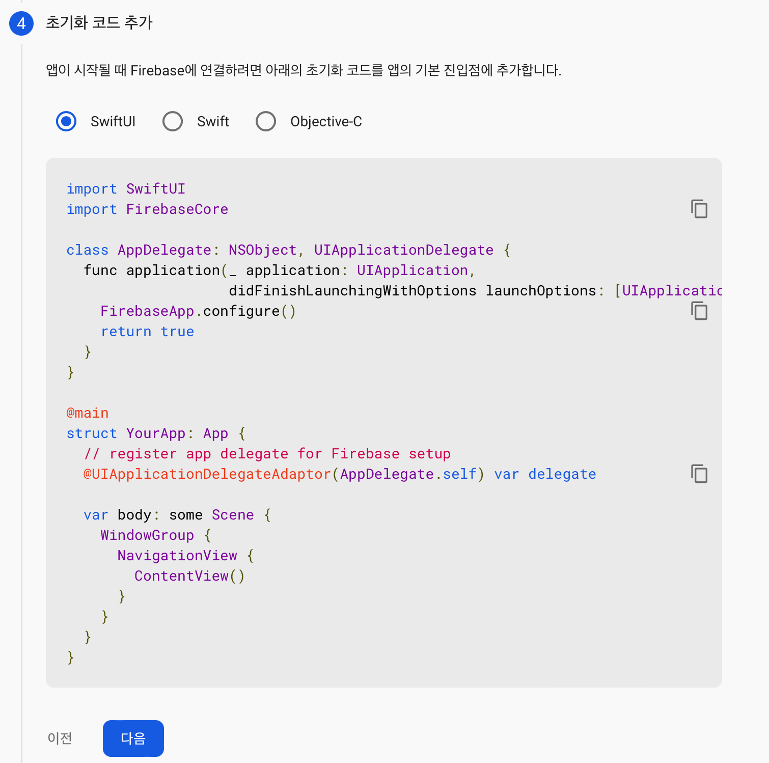 시키는대로 appDelegate에서 초기화 코드를 추가해줍니다.