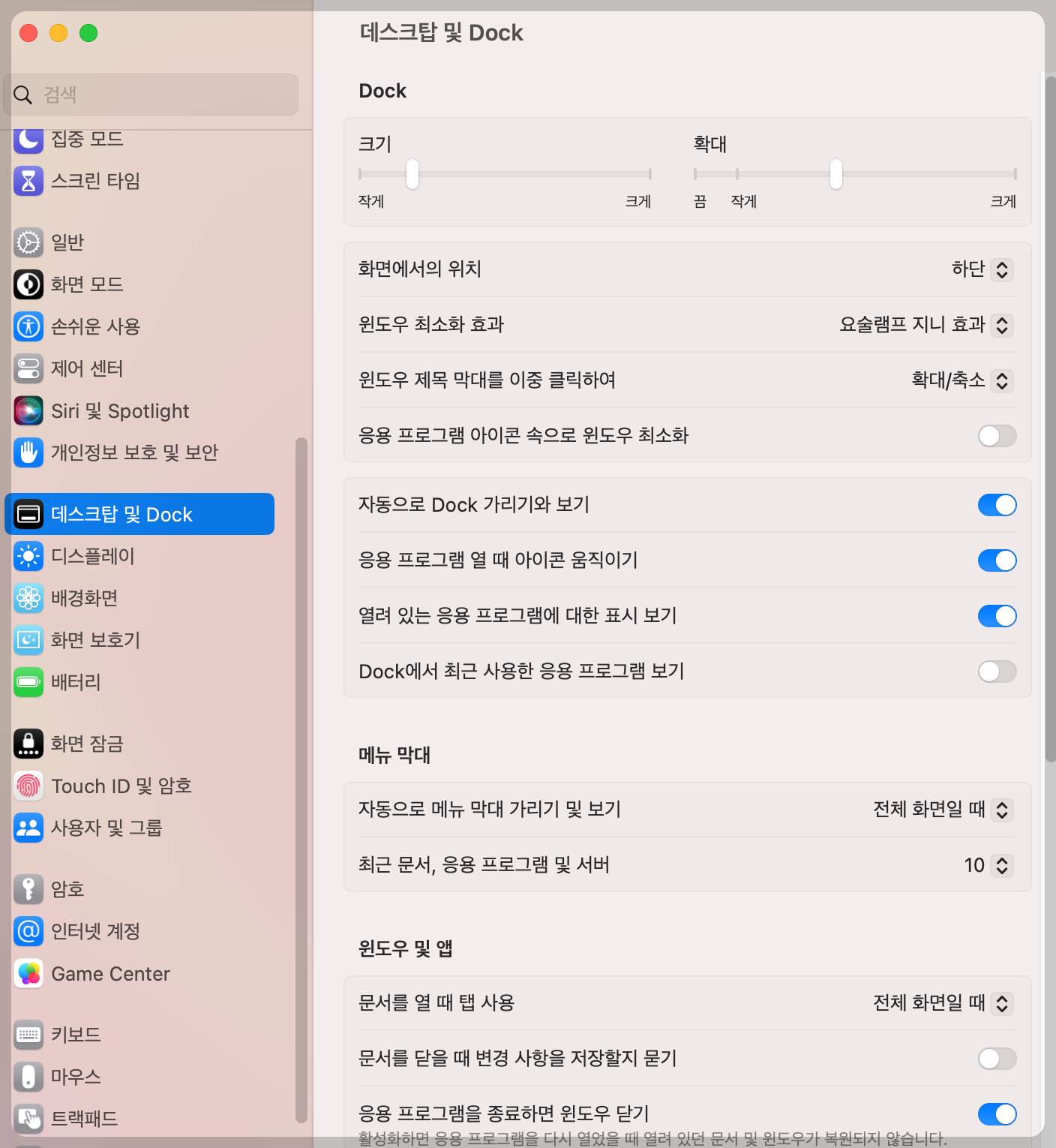 시스템 설정으로 들어가신후 데스크탑 및 Dock 으로 이동합니다.
