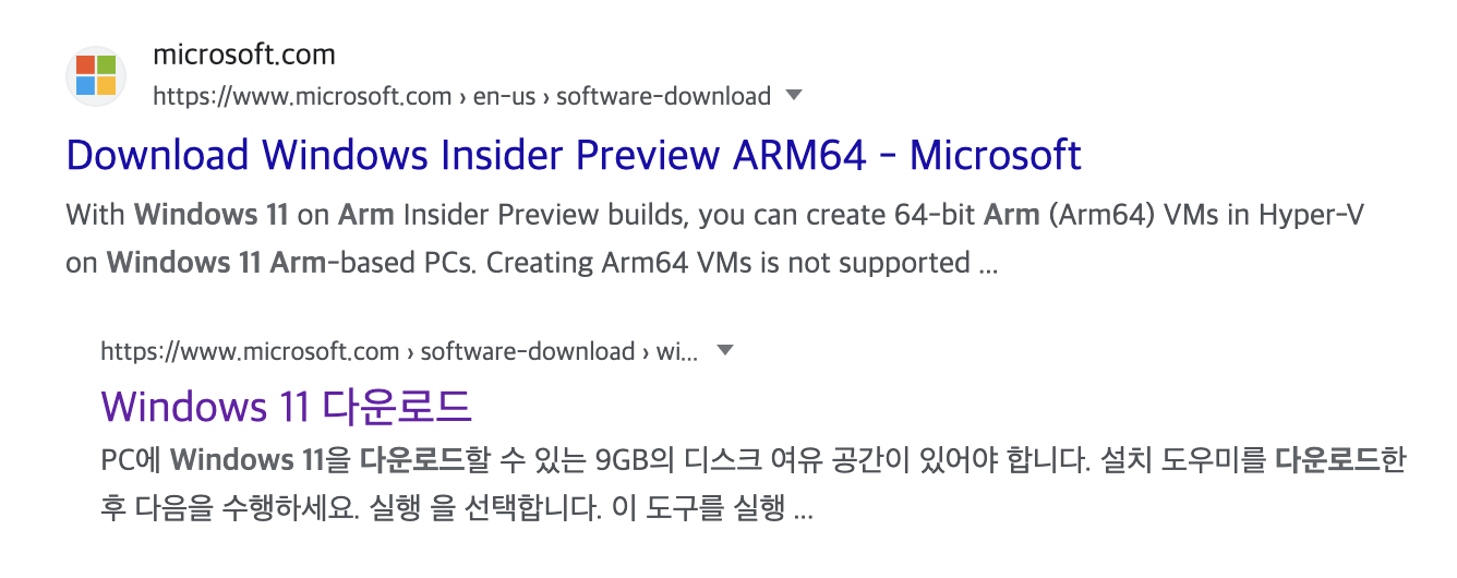 우선은 정석대로 구글에 arm 윈도우 11 다운로드 를 검색하겠습니다.
