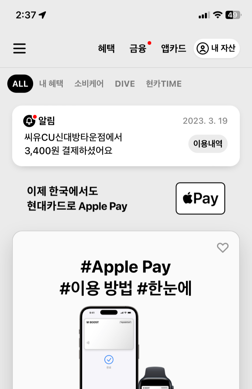 아이폰에서 현대카드앱으로 들어가겠습니다.