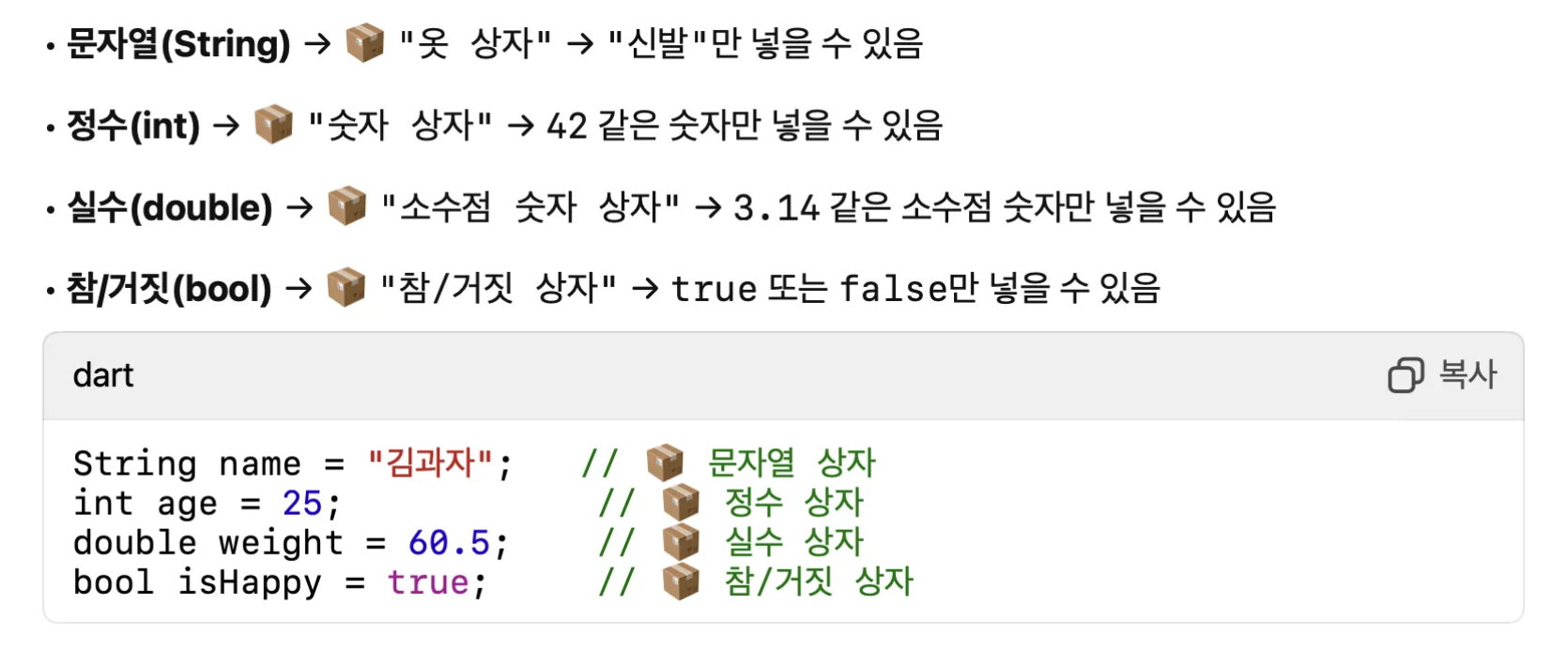 변수는 말그대로 변할수 있는 값이나 정보를 담는 일종의 상자라고 배웠습니다.