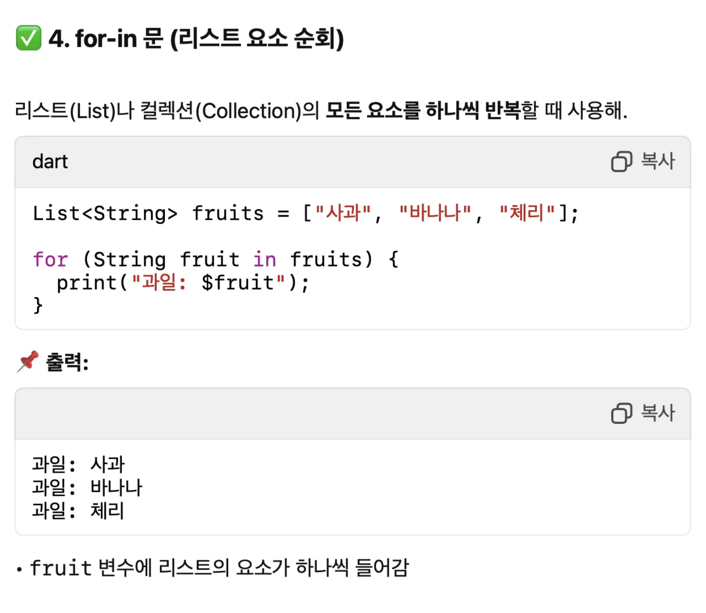 fruits 라는 과일 목록이 있고 이 안에 있는 것들을 순차적으로 반복해서 출력해주는 예제이죠.
