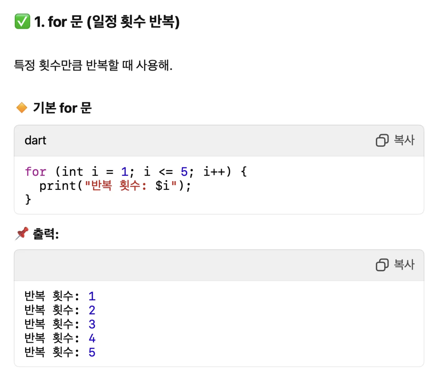 이렇게 반복을 통한 동작을 코드로 작성해야 할때는 for문 을 쓰면 됩니다.